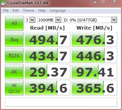 Our first benchmark does not disappoint, as the Crucial M550 pumps out write speeds of up to 514MB/s and read speeds of up to 563MB/s. This is right in-line with the listed specifications, and quite impressive results for our first test.