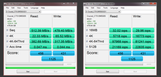 AS SSD Benchmark uses incompressible data in their testing of SSDs, essentially providing results that would be consistent with using the heaviest workload, thus lower speeds are expected. Transfer speeds (MB/s) are seen in the left picture below and IOPS (Input/Output Operations Per Second) are the right.