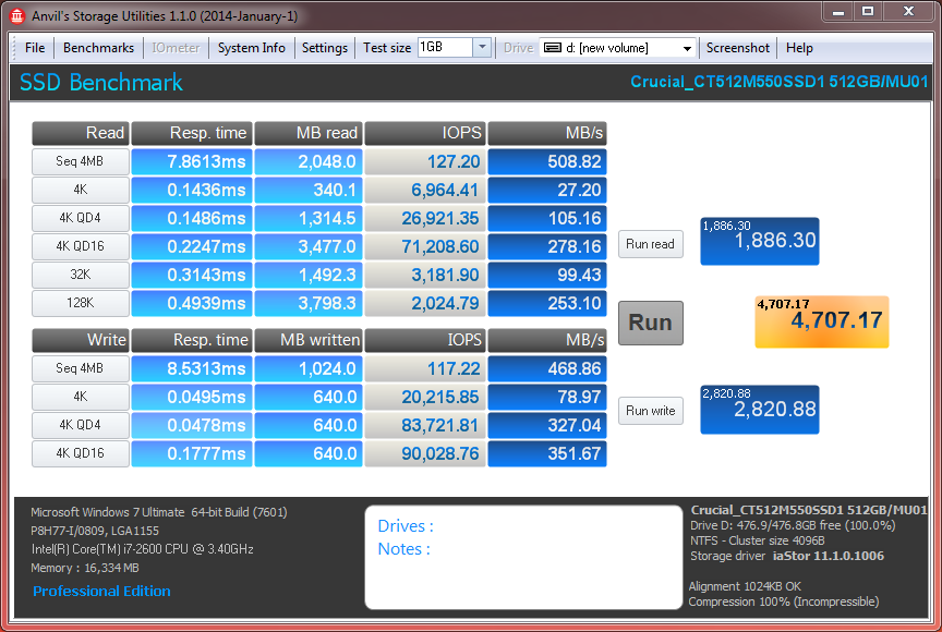 ASU produces similar scores to what we have already seen through our other benchmark tests, as the Crucial M550 produces a sequential read speed of 508MB/s, and write speed of 468MB/s. The SSD also produced a total score of 4707.