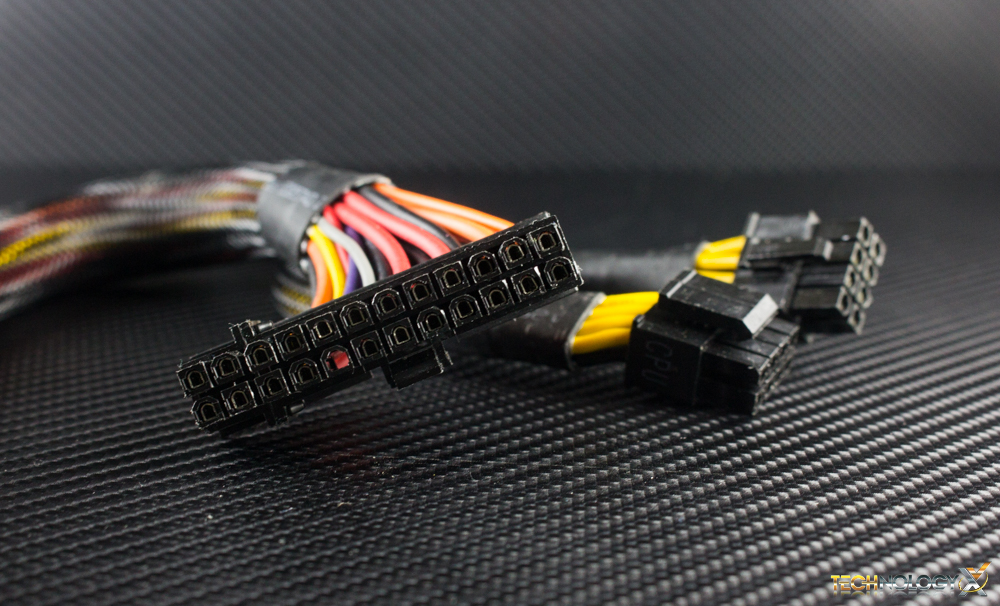 Taking a look at the included cables, we have a total of 4x 6+2-pin PCI-E cables, which measure 540mm in length. We also have another 2x PCI-E 8-pin/6+2-pin PCI-E cables which measures a total of 695mm. We also have 2x SATA power cables which measure a total of 990mm, as well as 2x 4-pin Molex connectors which also measure a total of 990m. Finally, we have 2x SATA+Molex cables which measure 1,140mm in length total. This gives us plenty of expand-ability for multiple graphics card configurations, and large amounts of storage options.