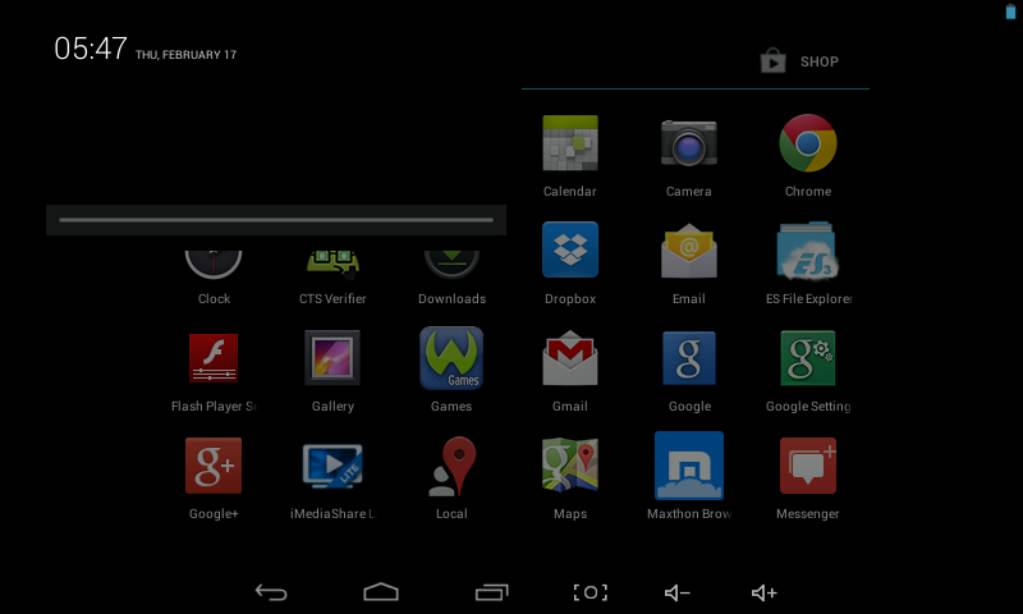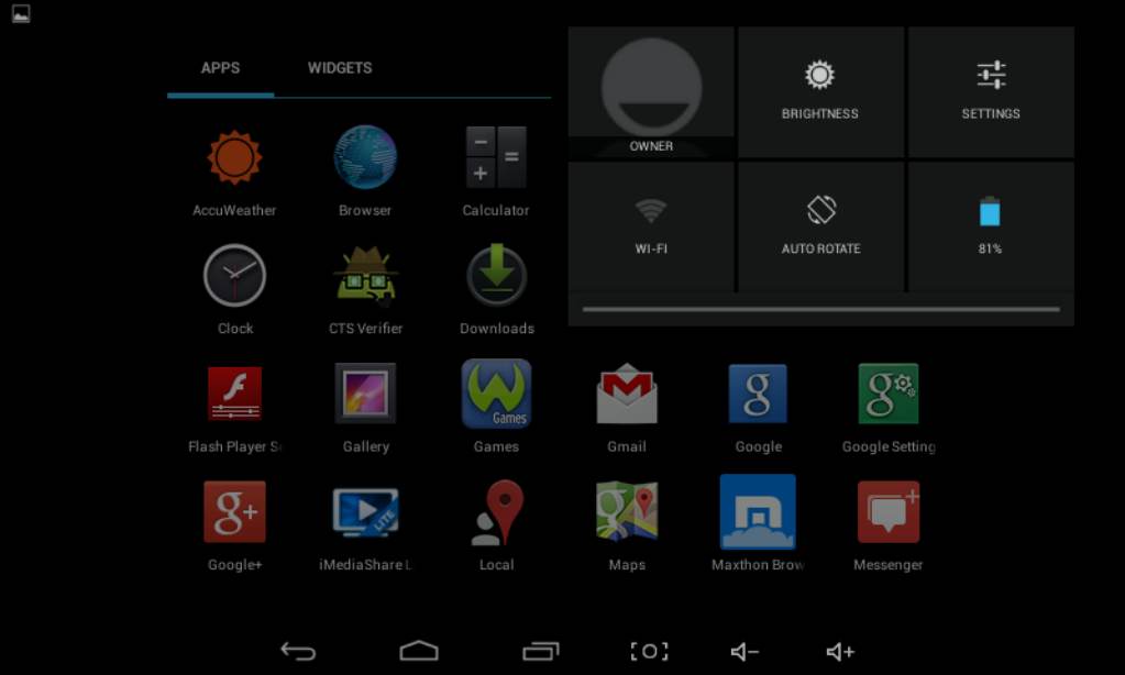 Digital2 has included a small overlay with their Pad Deluxe that is small change from the stock Jelly Bean operating system. As seen below, the notification bar has been split into two different sections, the right side features six quick buttons that allow you quickly enable/disable WiFi or Auto Rotate, change brightness, or jump to your contact info or even to settings.