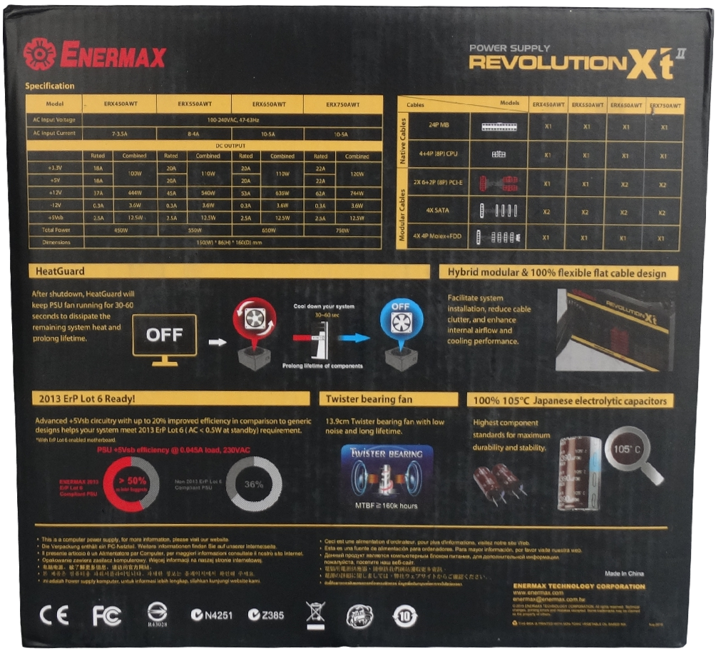 The Rev XtII comes in a retail ready packaging that is a black box with the need-to-know particulars highlighted. On the top-side you’ll see it’s 750W rating as well as the Gold 80+ standard and a picture of the PSU’s fan side. Flipping over to the backside you’ll get a more in-depth look at the specs not just for the 750 but down to their 450 model.