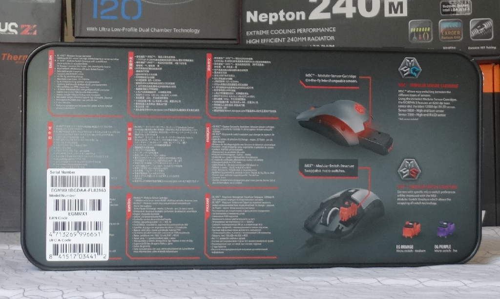 Around the back side of the casing you’ll get much more information on the specifications of this mouse. Such as the on-the-fly interchangeable sensors, adjustable weight and balance system to name a few.