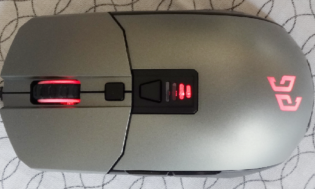 Additionally, from the top view you can see the dual lit sides of the scroll wheel, which have a mud-tire like tread to it and the two final buttons south of that. Quickly plugging the mouse in we can find out the square button controls profiles and trapezoid controls DPI settings.