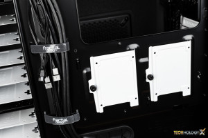 Turning to the back side, we can see straight away that they have decided to integrate Velcro straps to tie down the cables behind the motherboard tray, a very nice integration. There is also 20 – 35 mm of space behind the tray for cable routing, which is more than enough in our experience. When looking at the rear of the HDD mounting section there is a lot more room for SATA cables to go in than in any case we have seen before. Also, the cages and HDD trays have been redesigned to allow for even better airflow.