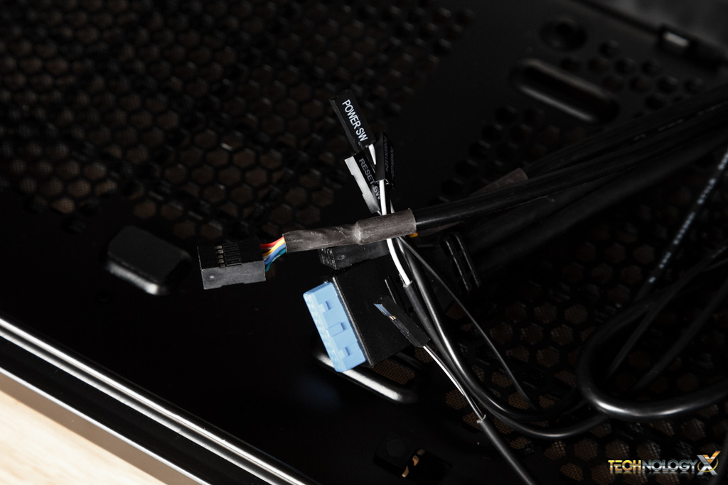 The front panel power, reset, and HDD activity LED connectors, as well as fan cables, are all sleeved in black. There is an audio in/out cable and the USB cables have connectivity that for both USB and 2.0 so there is no need of an adapter.