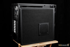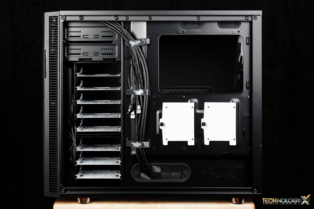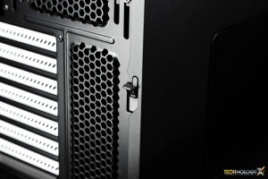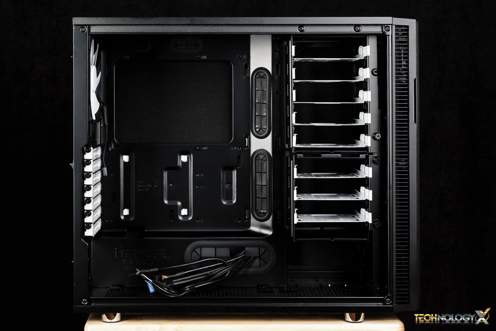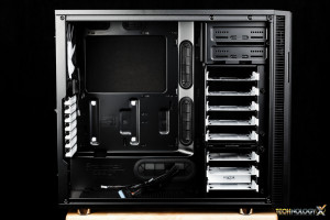 Inside the front side the design is quite nice. The PCIe slots and HDD trays and fans all act as accents. The motherboard tray can hold ATX, Micro ATX, or Mini ITX motherboards and we can see that there is a huge cutout in the back of the tray to give you more room to install a CPU cooler. This case can support air coolers up to 180mm (6.3″) in height, such as the Phanteks PH-TC14S we just reviewed. The tray is also stepped and the side grommet are actually angled to make cable pass through easier.