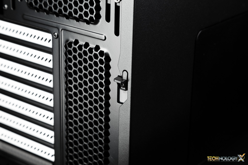 To open the case, there are two thumbscrews for each side, however the main side has a latch you can use instead. Also, the back side panel features captive thumbscrews so they never go missing. Once off, you can see that the side panels have a nice layer of their sound dampening material and you can see it is cut out around the pressed in 140mm fan mount.