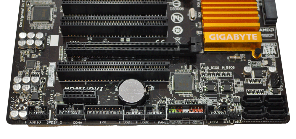 Without hesitation, let’s jump straight into things and start taking a look at our jumpers and connectors that are located along the lower edge of the Z97-D3H. Starting left and working our way to the right side you’ll find your front panel audio connector, which runs on the Realtek ALC1150 chipset, SPDIF header, COM port, TPM header, two USB 2.0 headers, case front panel connectors, another USB 2.0 header, a 4 pin PWM fan header and last but not least there are 4 SATA III ports in the lower right hand corner.