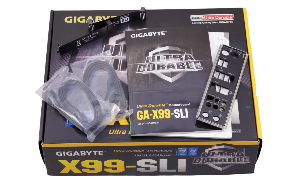 When we opened the packaging there is a simple, but effective tray that contains the motherboard wrapped in the usual anti-static bag. This tray separates the board from the accessories, where you will find the included accessories; the motherboard’s I/O shield, manuals, and driver CD. We were disappointed that Gigabyte only included two SATA cables which both are 90 degree. The accessories also include a SLI as well as a crossfire bridge.
