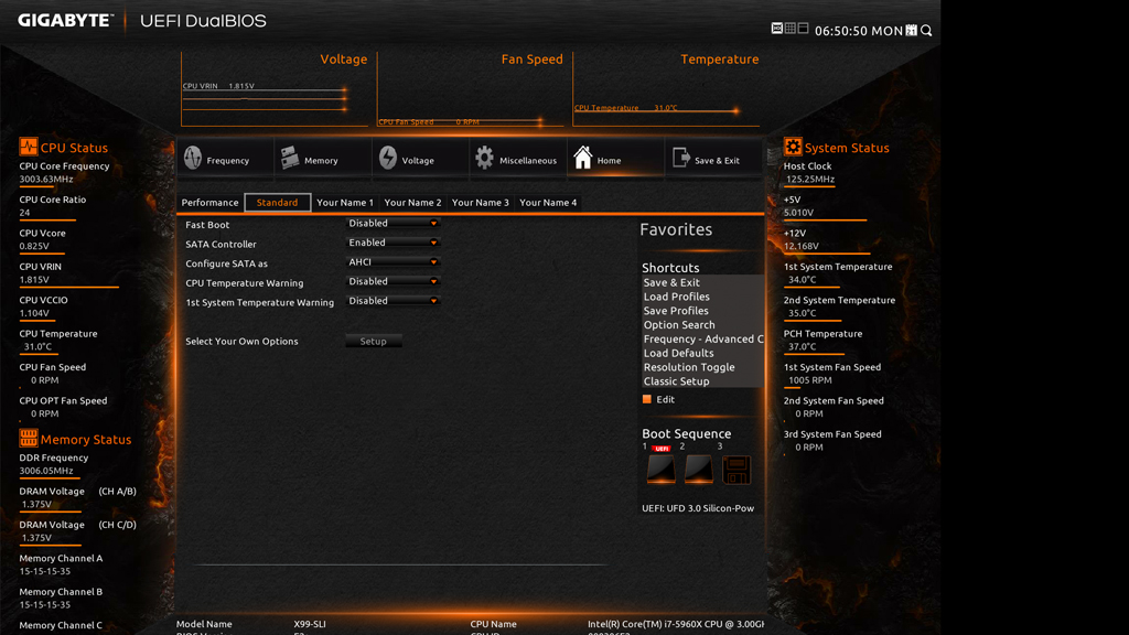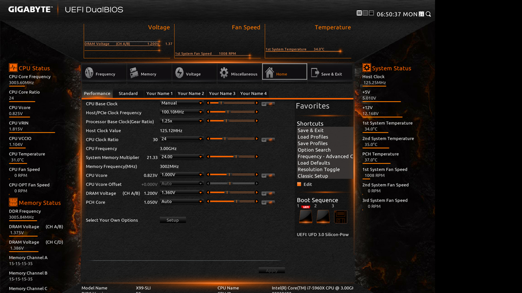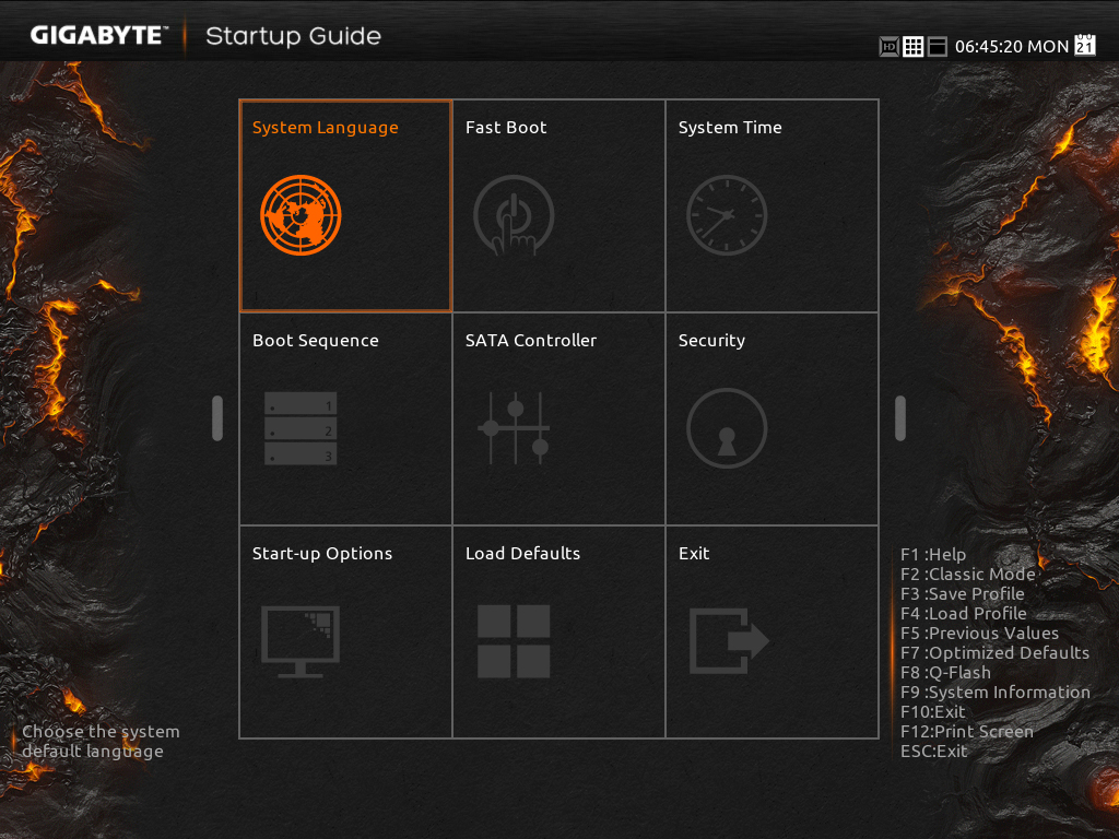 With Gigabytes newer line of motherboards you get three UEFI interfaces which are the standard ‘Classic Mode’, a high definition ‘Smart Tweak’ mode which offers a more detailed look and is designed to take up all the real estate of your screen allowing to display more of your system information. At first you will be presented with a ‘Startup Guide’: this allows you to setup such parameters as time/date, language and a few other options as seen. You can toggle F2 to enter either ‘Classic Mode’ or ‘Smart Tweak’ mode as well as save a profile, load a profile or load optimized defaults as well as a few other options. The ‘Startup Guide’ is straightforward so we will look more in depth at the actual overclocking interfaces.