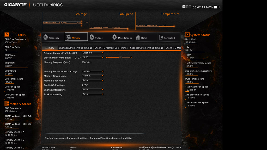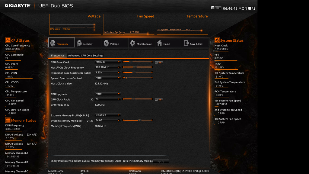 The first main window named ‘frequency’ is where you adjust your various CPU and RAM settings such as XMP. There is also a secondary tab called ‘Advanced CPU Core Settings’ such as enabling hyper-threading or HT plus a few more settings that are not so much required for overclocking this motherboard unless you want to overclock your cache, disable Intel Turbo Boost or play with PLL settings.