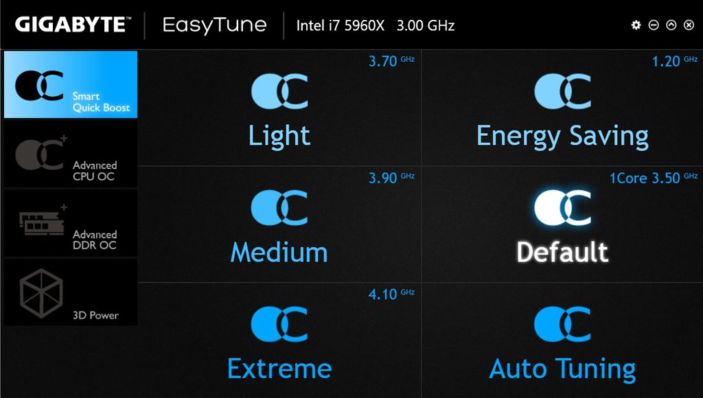 The application consists of 4 main menu options: ‘Smart Quick Boost’; this allows you to choose from a variety of pre-configured CPU frequency settings. You can also select ‘Auto Tuning’ which will automatically overclock your system to it considers the best possible settings for your hardware. That said, using these options is not always the best idea as they can apply more voltage than is usually required so we advise to look deeper in to the application’s advanced modes.