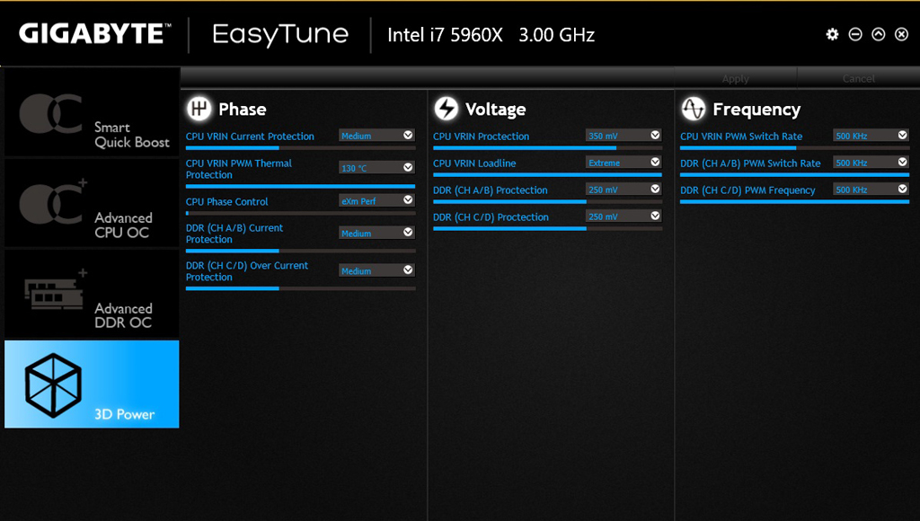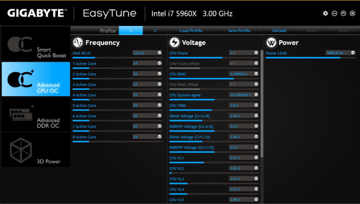 In the advanced modes you have more control over your system settings. Advanced CPU mode allows you to configure clock ratios and voltages down to vCore, System Agent, Ring (Cache) and RAM plus a few more. Advanced DDR OC allows you to fine tune your memory including timings and frequency. Lastly 3D Power lets you tune various protections, switch rates and even phase control.