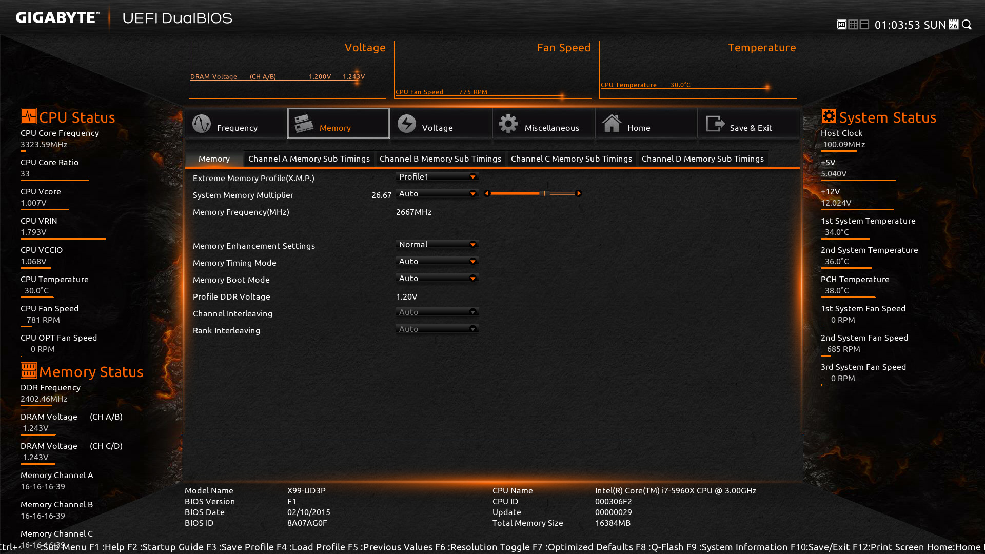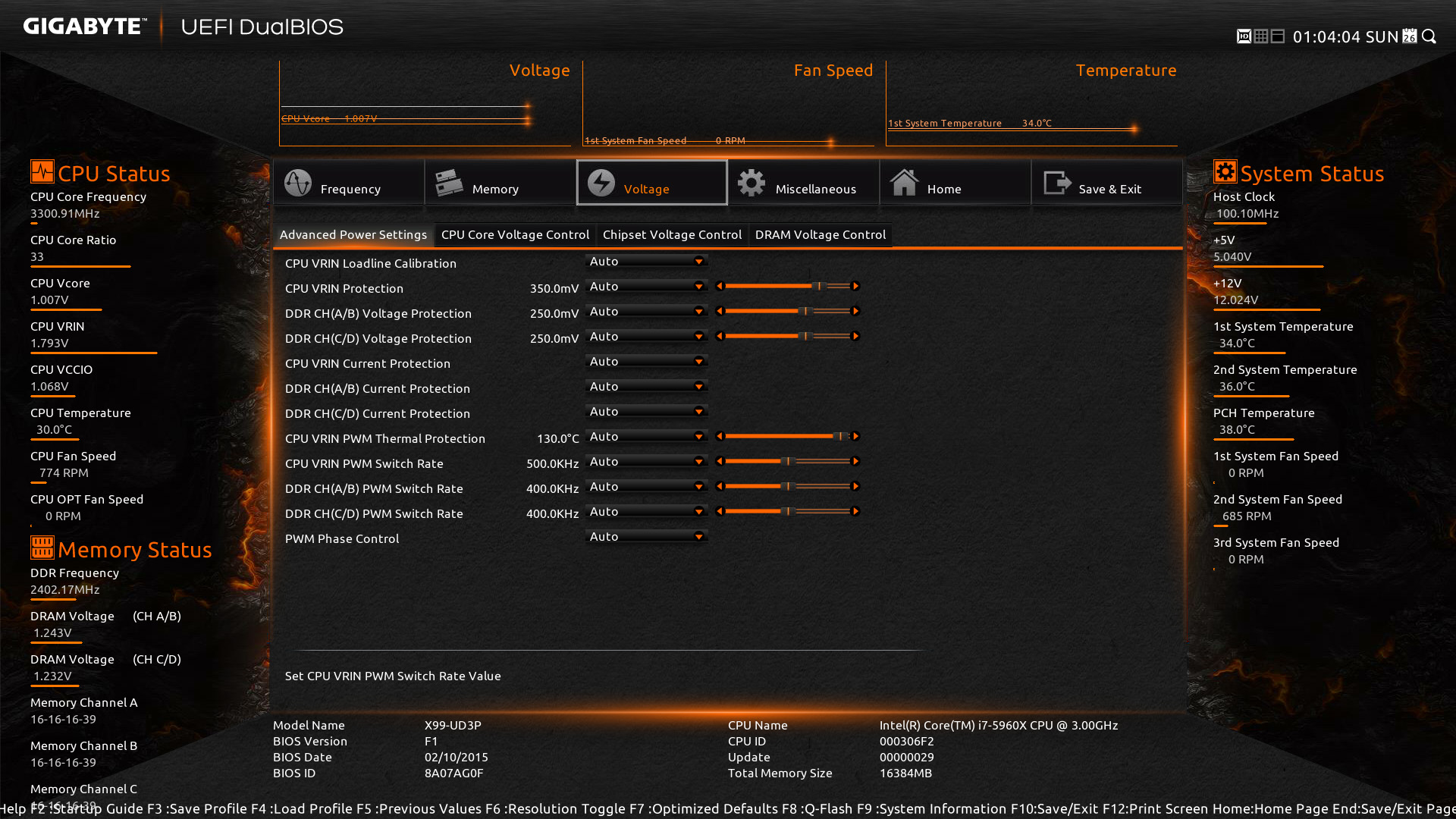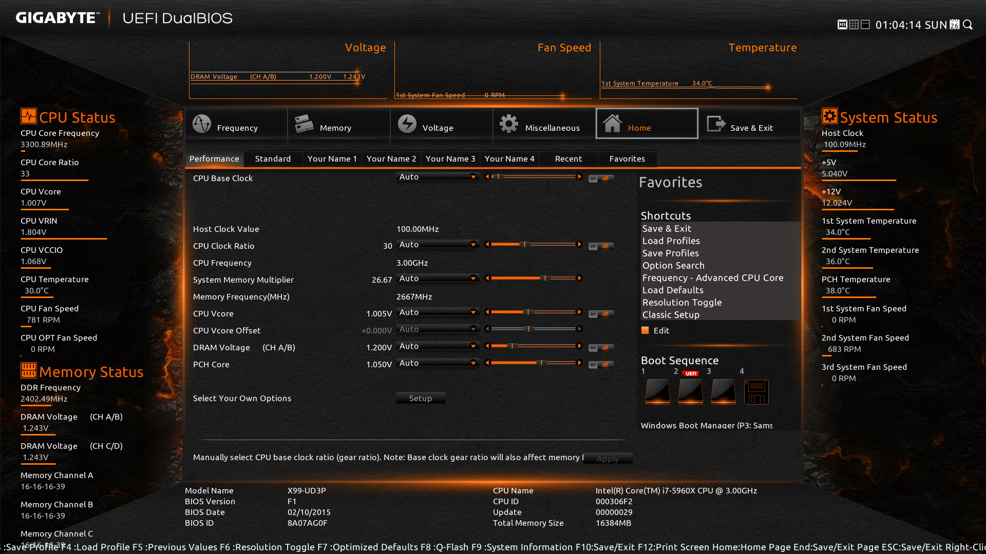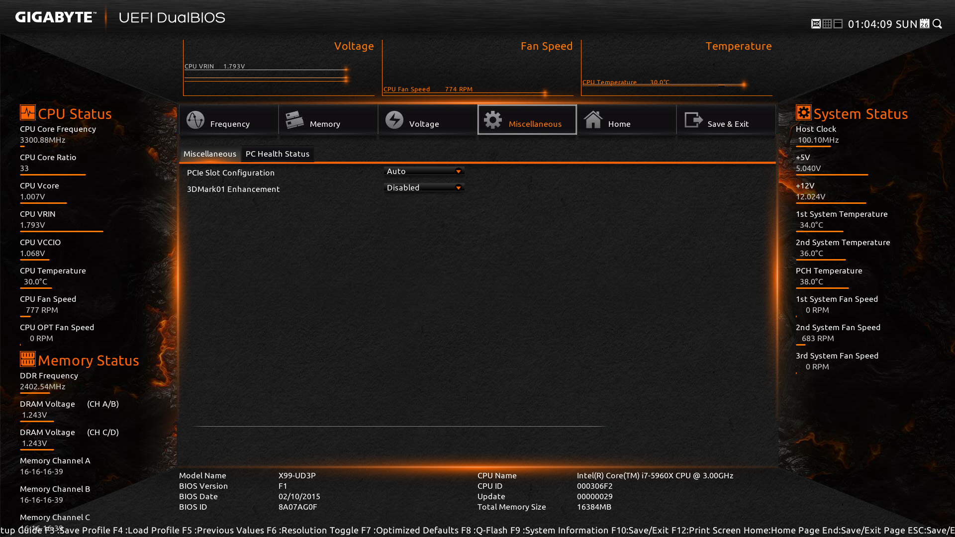 The other menu options include ‘Memory‘; which allows you to adjust memory settings such as XMP profiles, frequency, and timings. ‘Voltage‘; which allows you to change various system voltage settings such as the vCore voltage. ‘Miscellaneous‘; here you can adjust PCIe slot configuration settings and enable 3DMark01 Enhancement. ‘Home‘; a customize-able screen which allows you to create shortcuts and performance profiles. Finally, there is ‘Save & Exit‘ which is fairly straightforward.