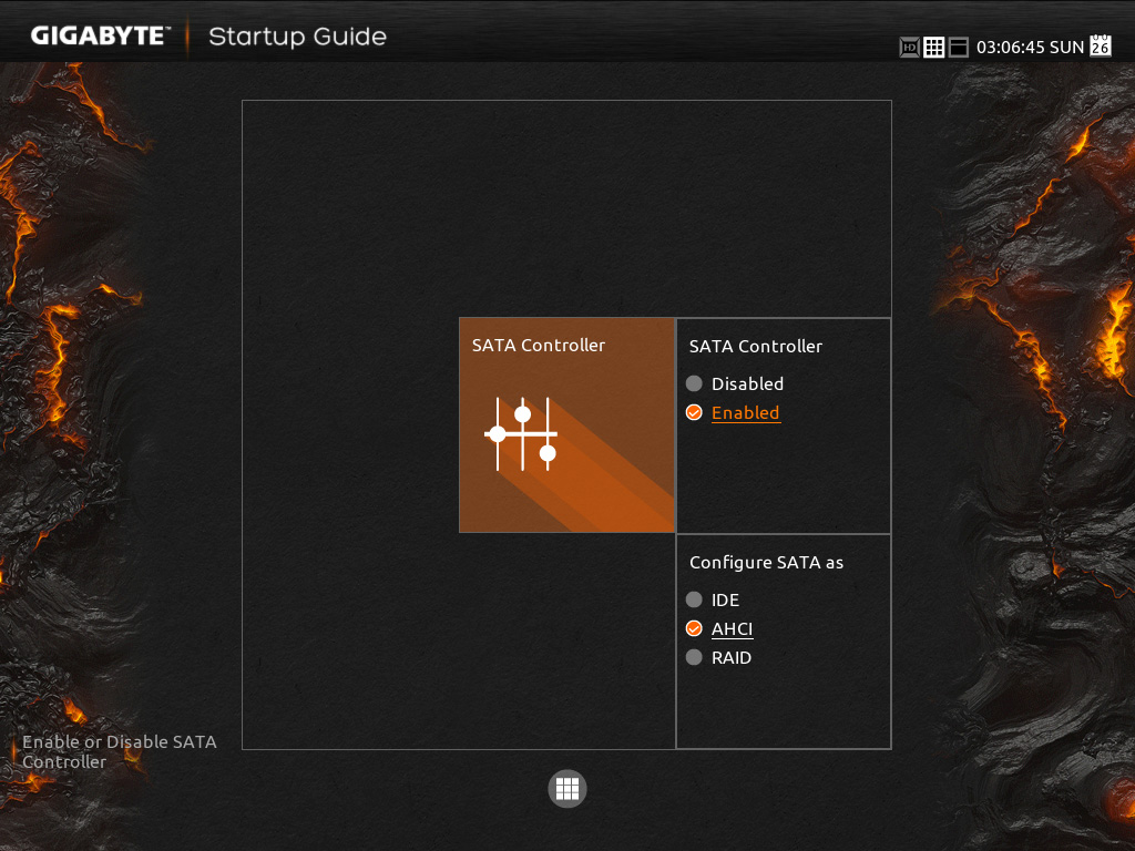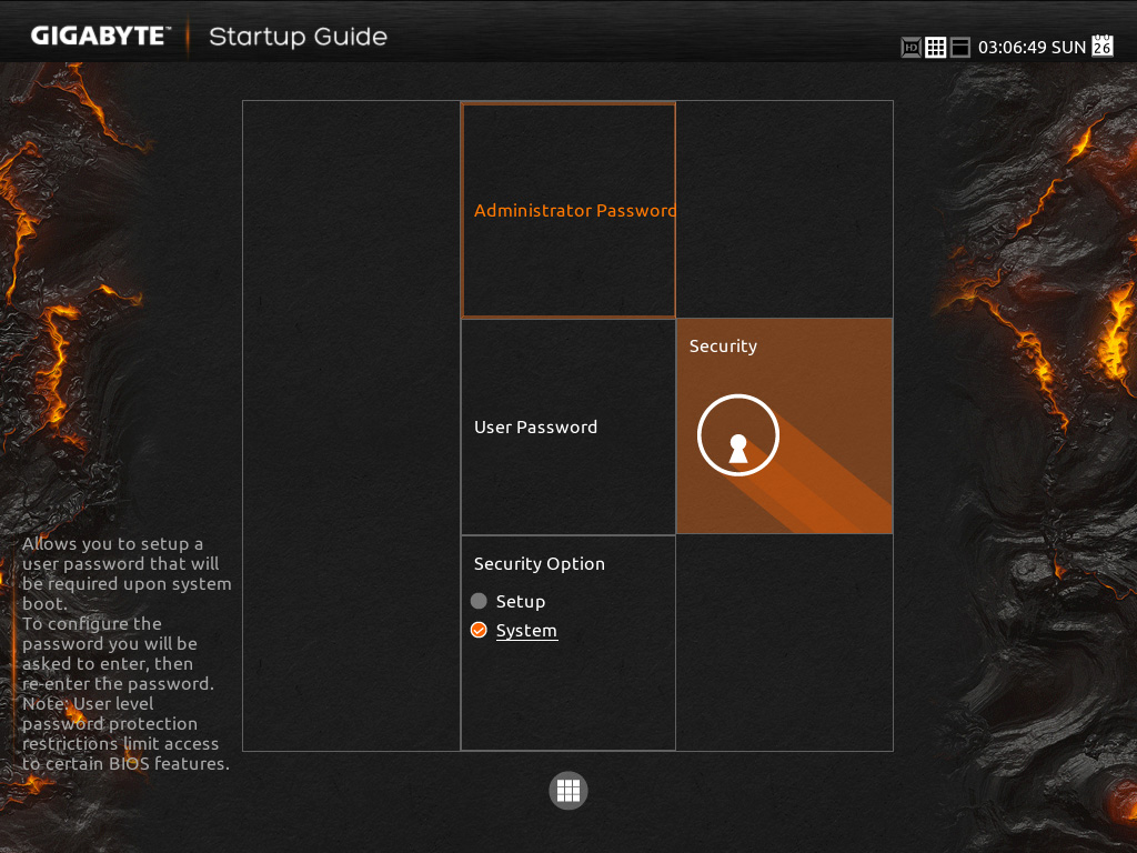 Those nine options include ‘System Language‘; which allows you to change the selection you just made. ‘Fast Boot‘; here you can enable or disable the fast boot. ‘System Time’; allows you to set the system time and date. ‘Boot Sequence‘; here you can set the order of boot devices. ‘SATA Controller‘; allows you to enable or disable the SATA controller, and switch between AHCI, IDE and RAID modes. ‘Security‘; here you can set or change User and Administrator passwords.