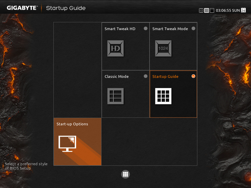 When you first boot into the UEFI you’ll enter the ‘Startup Guide’, once there you’ll be asked to select a system language and then you’ll come to a screen which is essentially just a grid of nine basic menu options. You can also toggle F2 to enter into ‘Classic‘ or ‘Smart Tweak‘ mode.