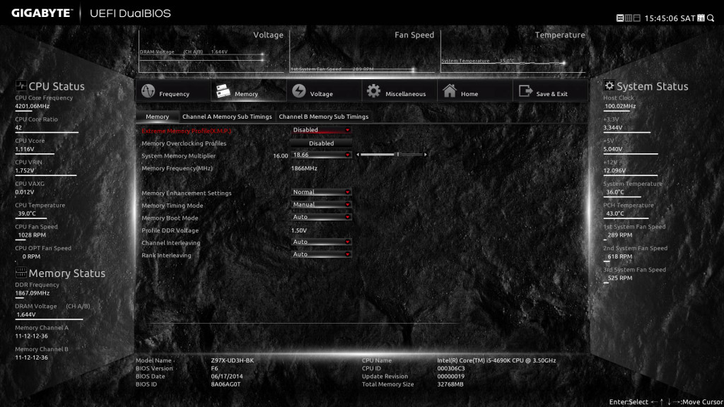 The next tab is the Memory, which allows changes to speeds XMP Profiles, Memory overclocking profiles, the Memory multiplier and the other settings that would be expected.