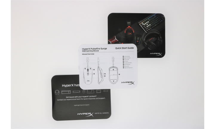 An obvious addition to the surge is the manual, warranty info as well as a thank you card from HyperX. The quick start guide describes all of the available buttons and how to connect this peripheral.