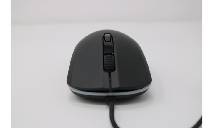 Here we see the front view of HyperX’s Surge. The braided cable runs right of the front of this ambidextrous mouse. In addition we see the DPI button up top as well as part of the RGB ring encircling the entire perimeter of the mouse. Both the left and right mouse button are rated for 50 million clicks and consist of Omron switches.