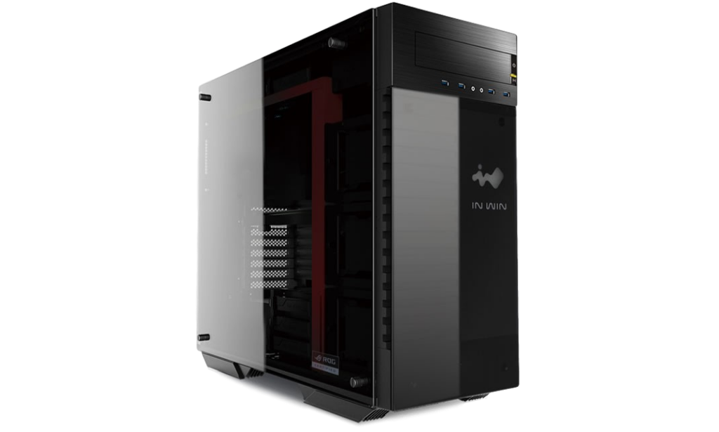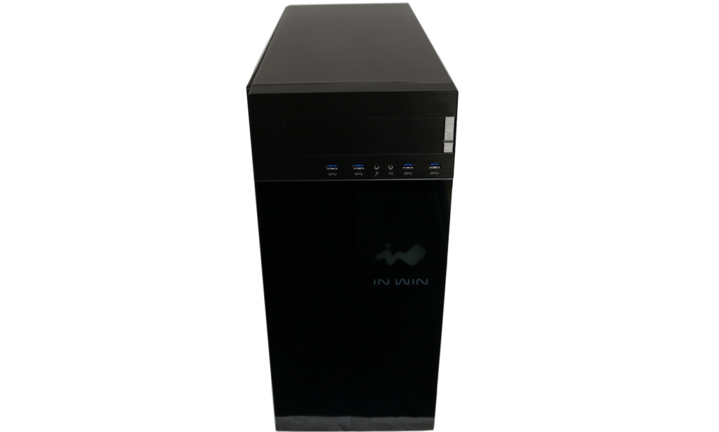 An LED logo is also installed on the right side of the glass to give the case a little accent. The top of the In Win 509 is a flat black panel. Four thumbscrews secure the seamless tempered glass, giving you about an inch of space for airflow.