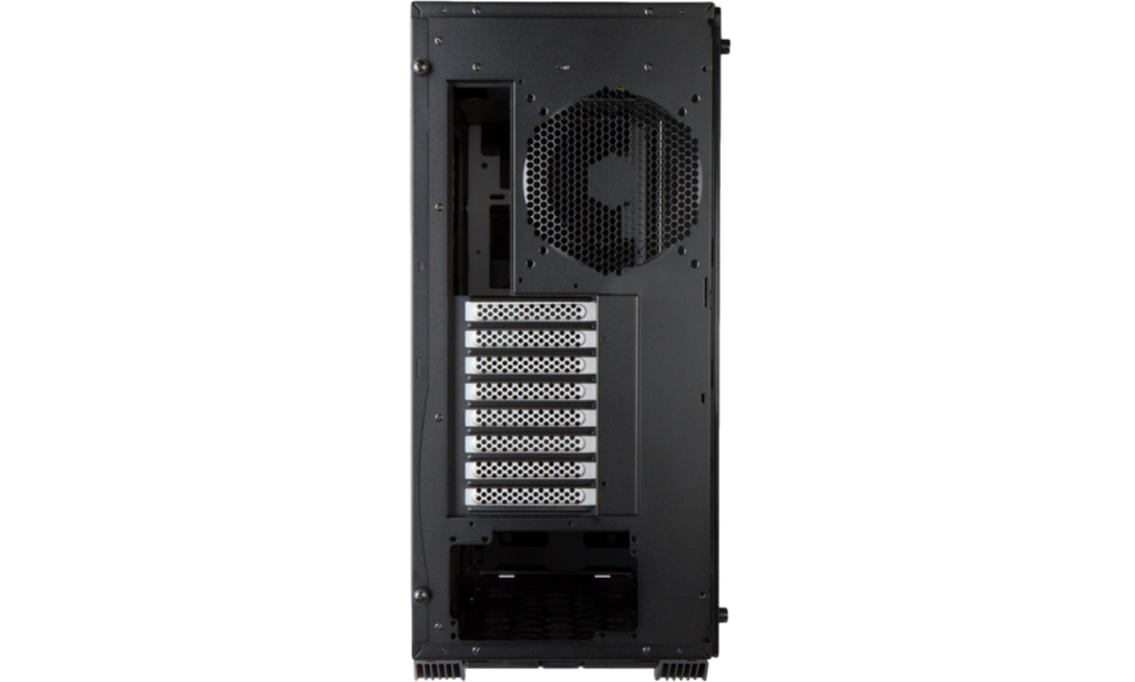 The rear is comprised of a 120/140mm fan slot, motherboard I/O and eight PCI-E slots. Located at the very bottom is the PSU mounting hole.