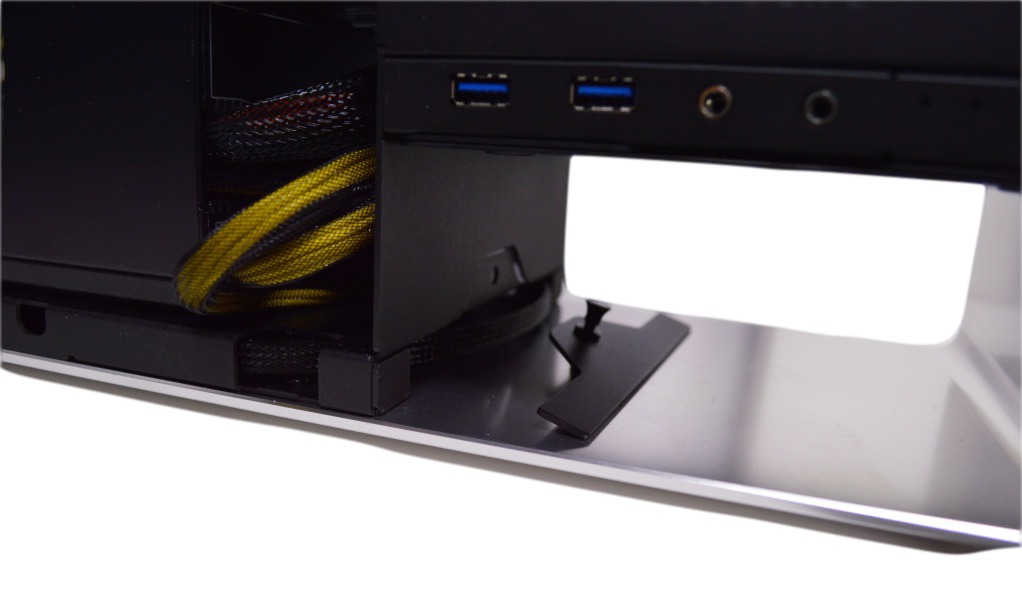 Also found on the back, just slightly more interior than the removable piece of aluminum, is where we connect our prized peripherals to our motherboard via the input/output panel. We found that connecting your peripherals, after you have placed your glass side panels onto your system, can be hard as there is not much room to position your hands. There is just shy of 2.5″ to maneuver your hand and a USB cable within this space. However, once the peripherals are installed, and the side panels are put on afterwards, the clever peripheral management is exceptional.