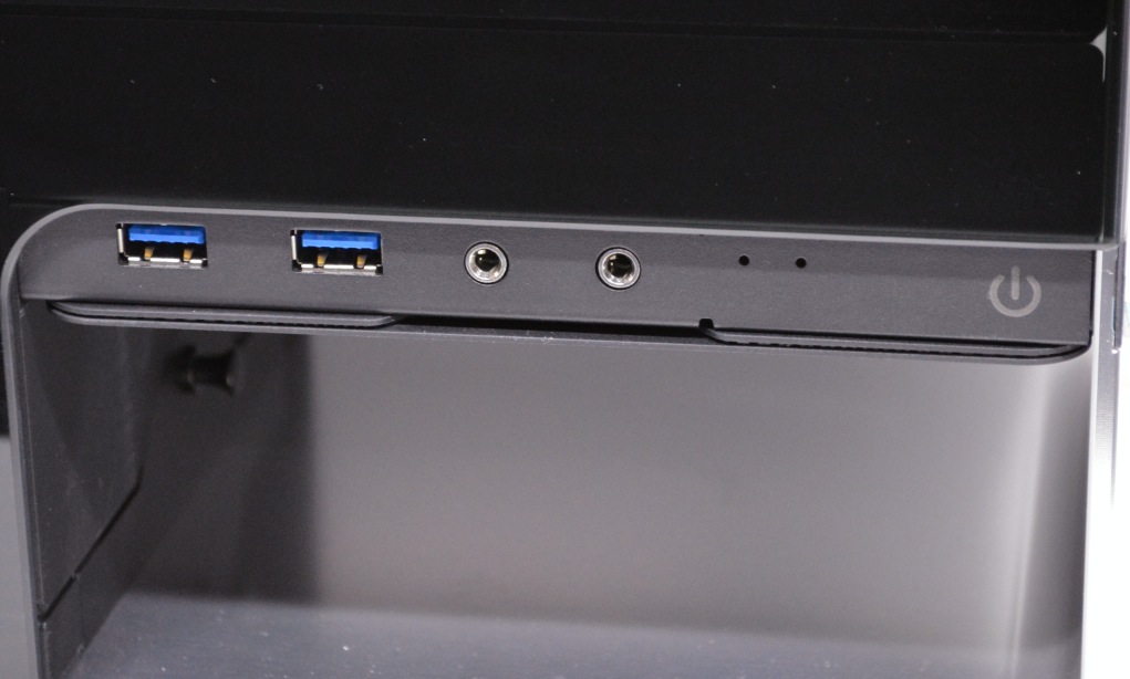 The input/output panel features two USB 3.0 Super Speed ports, two HD audio ports, a disk drive status indicator, a power indicator, as well as the power button.