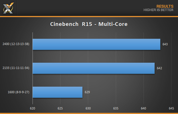 As we can see the benchmark really likes higher clocked memory as opposed to lower timings at lower speeds. The 2400MHz configuration takes the cake easily.