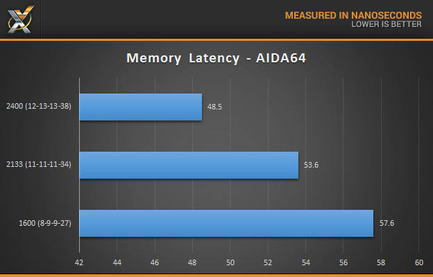 As we can see the lowest speed and tightest timings come in last. The 2400MHz kit is about 10% faster than the 2133 kit and around 15% faster than the 1600MHz kit.
