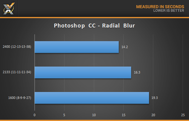 Usually Photoshop likes tighter timings rather than higher speeds, but this time the higher clocked configuration won out. The 2400MHz kit won out by around 35%