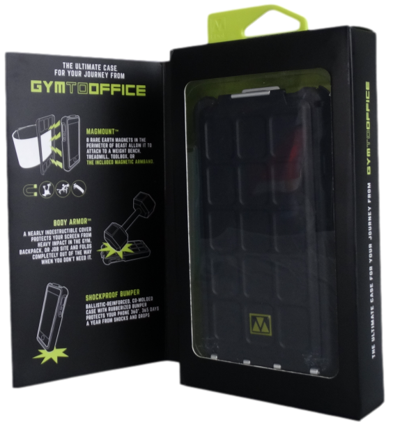 The Front cover is magnetic and opens story-book style. When you open it up you’ll get your first glance at the Beast. It looks strong and sturdy with the green M-Edge logo at the bottom. the backside of the front cover will explain a little more about the Magmount and Body Armor. The Magmount being comprised of eight rare earth magnets in the perimeter of the Beast allowing it to attach magnetically to anything you’d want/expect it to.