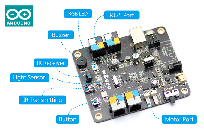 The Arduino platform makes life simplre, as you can see from the image below this board provides everything that is needed and more. It includes, a RGB LED, buzzer, IR Receiver, Light Sensor, Motor Ports and RJ25 Ports. Take a look at the specifications below:
