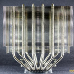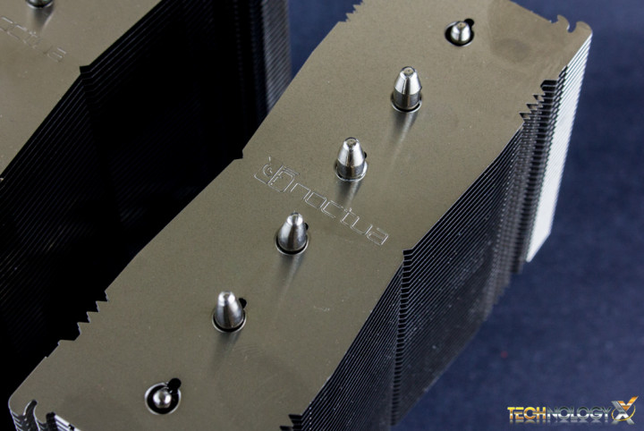 The base of the cooler, while reflective is not quite a mirror-finish. While at the top of the heat-sink we’ll see where the six copper heat-pipes are capped off, two of them slightly shorter than the rest. We’ll also find a Noctua logo embossed into both towers.