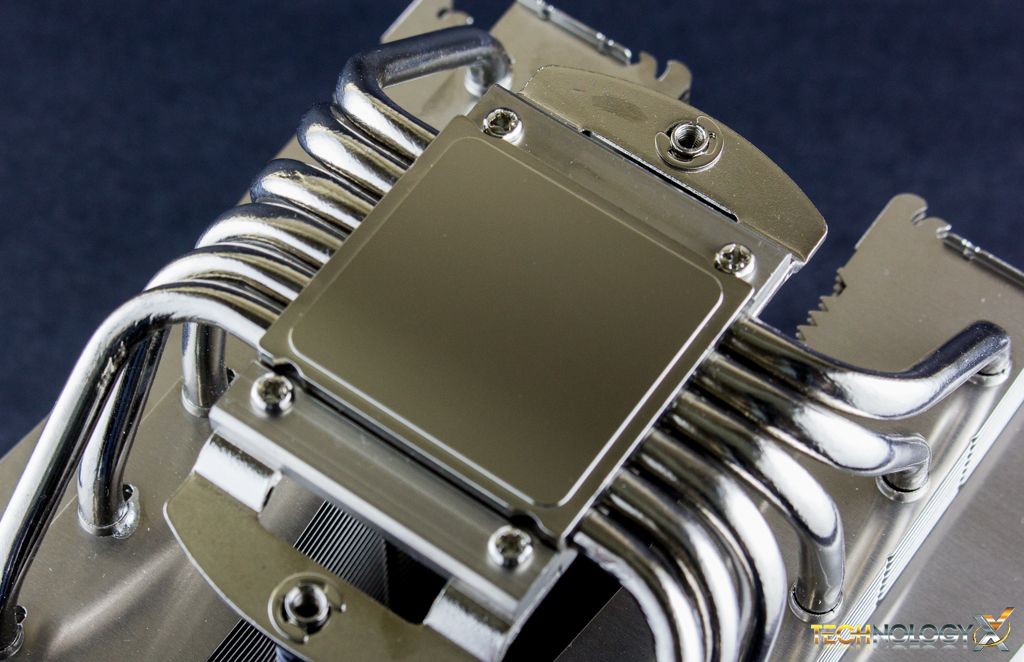 The six 6 mm nickel-plated copper heat-pipes which protrude out from the bottom of each of the dual heat-sinks into the base, have been spaced apart ever so slightly to transfer heat more efficiently.