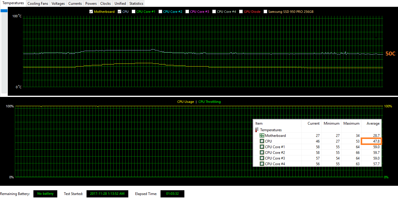 The next thing to do is boost up the voltage and the multiplier and get this beauty overclocking. For this we used Intel’s XTU, we found stability with at 1.350V and a multiplier of 50, putting us at 5GHz. We ran this same test for the another hour.