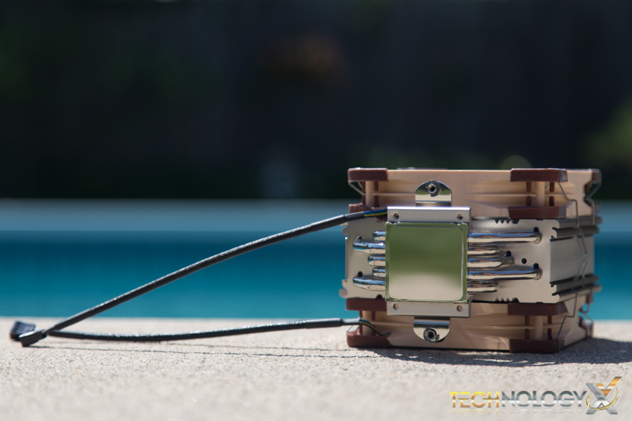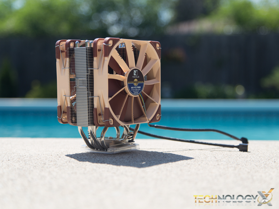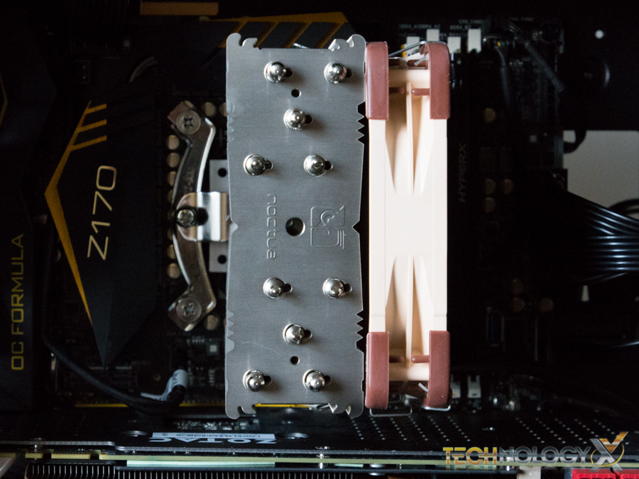 Once the heatsink is secured, our additional NF-F12 fan was added using the included clips by pressing the fan up against the heatsink and pulling the clips over the slotted sections on the heatsink. Carefully route and connect the fans power cable into a 4-pin PWM CPU fan header on your motherboard and we are ready for testing!