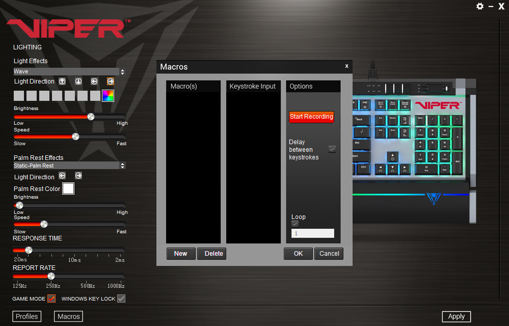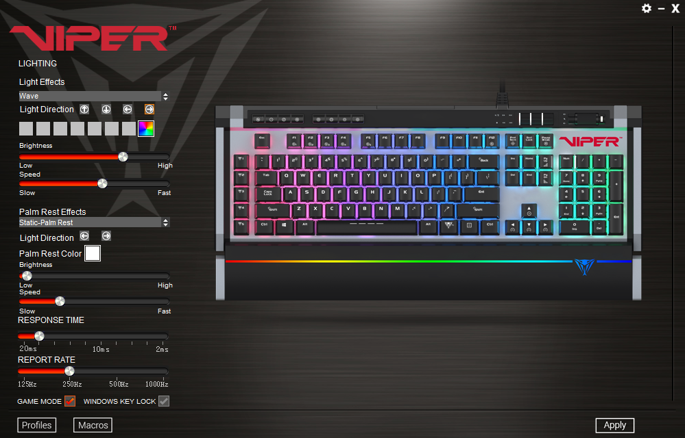 The palm rest has four options; static, breathing, vortex, and wave to choose from. The final two adjustable features are the Response time and the Report rate, from 20ms to 2ms and 125ghz to 1000ghz, respectively.