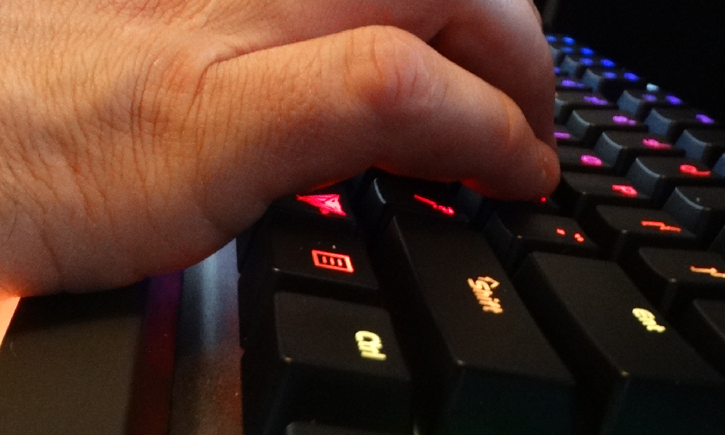 In the photo above you can see the base of the pinky is resting on the “Right-Click” keyboard button. During game-play you may want to disable the keys to the sides of the space-bar as they were frequently bumped and interrupted any activity we performed. This could be fixed by taking a millimeter or so off of the keys to lower them or to increase the height of the wrist rest. This is an odd one as it could be user preference but this is the first time we have ever noticed this issue on a board.