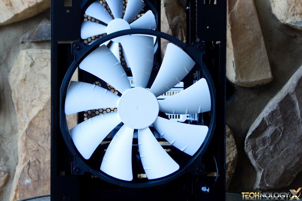 Taking a look inside our case we can see support for up to 2 140mm fans in the front or a single 200mm shown here, as well as 2 140mm fans on the top and a single 140mm on the rear also included here. The stock configuration seemed to do the job quite well and we imagine additional fans on the top would improve airflow dramatically.