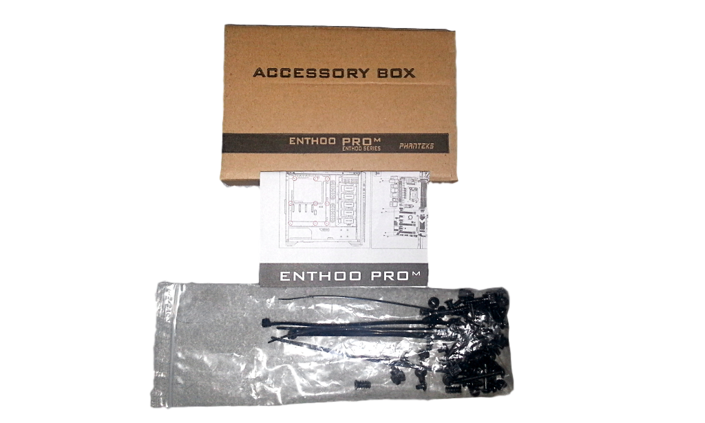 The HDD/SSD drive cage and power supply occupy a separate compartment at the bottom of the chassis. The dividing “floor” between the upper and lower section is well perforated to facilitate airflow. The supplied two drive trays are accessed from the right side of the chassis, rather than the left. The box of hardware and accessories is shipped occupying one of these drive trays. Opening the hardware box reveals an instruction sheet and a long Ziploc bag that contains a few zip ties, and an ample quantity of various screws for mounting components.