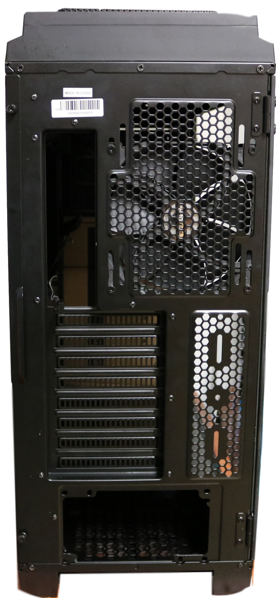 Located on the rear are a single fan exhaust port and eight motherboard expansion slots. You can also see a full size PSU slot.