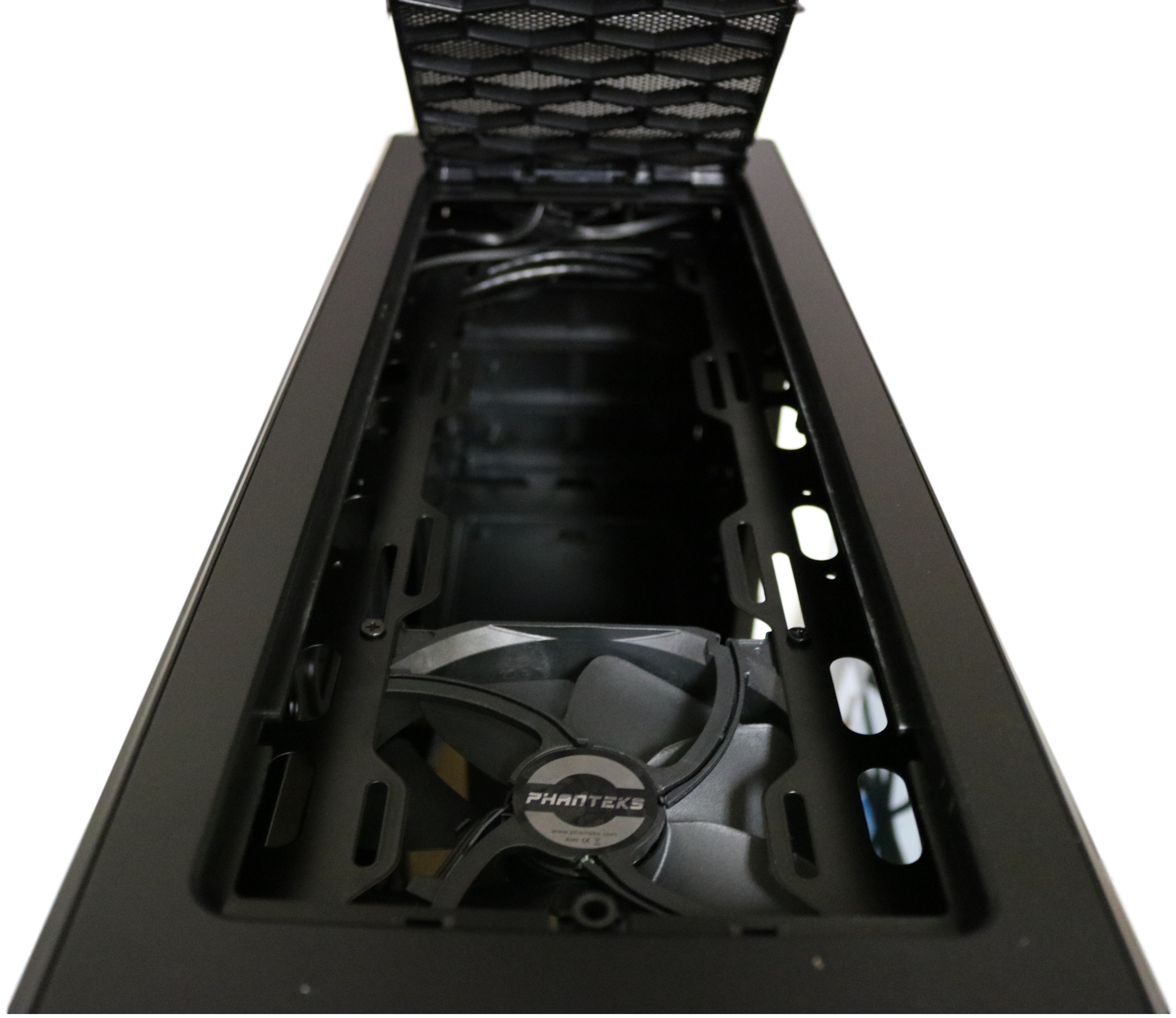 The only features on top of the chassis are the power button and the pop out dust cover/access panel. Oval in shape the power button sits near the front illuminated by the systems LED’s. The top of this case is taken up by two 140mm fan slots(or three 120 mm fan) that can be interchanged to the consumers needs.