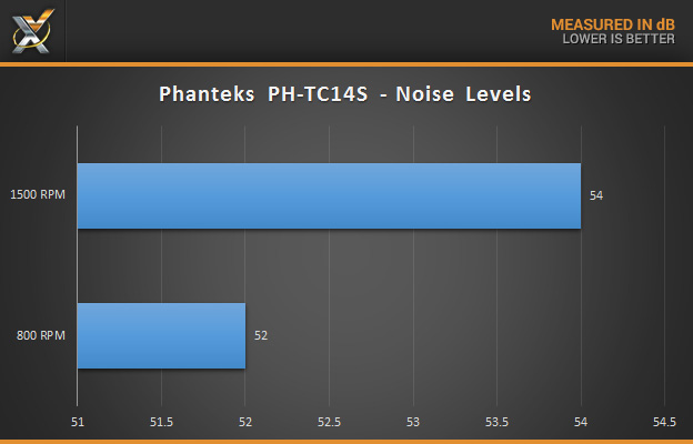 We tested the cooler’s noise output by using a sound meter placed near the system’s case with the side-panel closed. We tested the cooler at both full speed (1500 RPM) and an idle speed of 800 RPM. We also tested the sound of our overall system’s cooling without the cooler’s fan turned on to illustrate the difference. That result was an average of 50 dB.