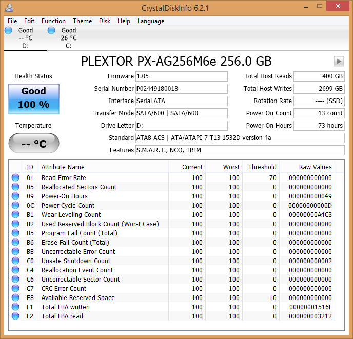 Crystal Disk Info is a great tool for displaying the characteristics and health of storage devices. It displays everything from temperatures, to the number of hours the device has been powered, and even to the extent of informing you of the firmware of the device.