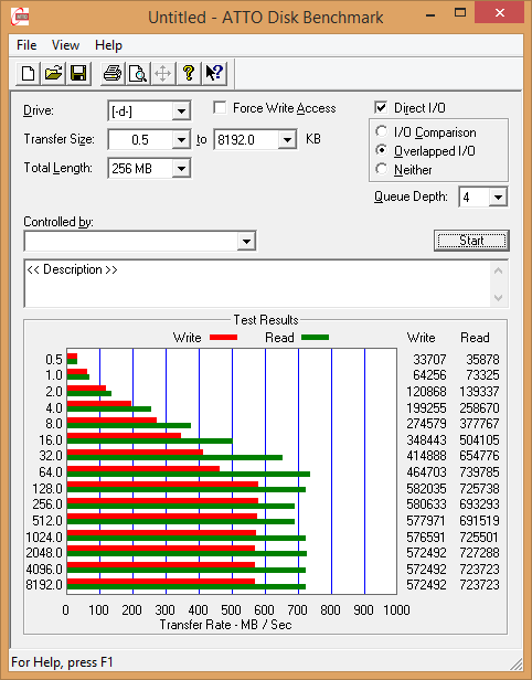 ATTO Disk Benchmark is a relatively easy-to-use benchmark tool, which happens to be the benchmark of choice for many manufacturers. ATTO uses compressible data rather than random data, which results in higher performance and thus, higher benchmark scores. In our testing, we have selected the transfer size to range from 0.5KB to 8192KB, and have set the total length of the test to be 256MB.