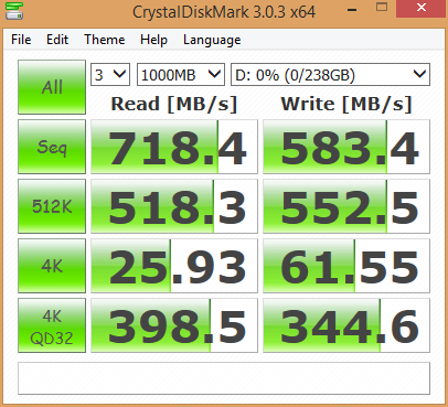Crystal Disk Mark uses incompressible data in order to test the transfer speeds of the M6e Black Edition. Incompressible data is that of videos and pictures, which cannot be compressed as easily as documents. The read and write speeds have returned with a slightly lower read speed, but a slight increase in write speed.