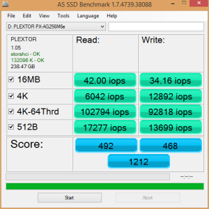 AS SSD Benchmark uses incompressible data in their testing of SSDs, essentially providing results that would be consistent with using the heaviest workload, thus lower speeds are expected. Transfer speeds (MB/s) are seen in the left picture below and IOPS (Input/Output Operations Per Second) are on the right.