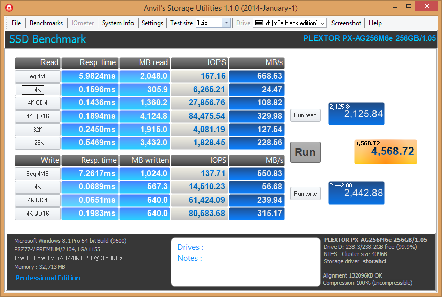 Anvil Storage Utilities is essentially an all-in-one tool for all of your SSD benchmarking needs. Anvil can be used for basic consumer testing, as well as endurance testing and threaded I/O read, write and mixed tests. It displays data regarding the SSD, and even about your system.