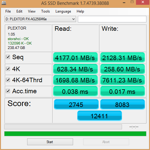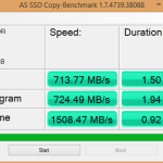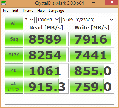 Now we are getting somewhere. With Crystal Disk Mark, we reach similar speeds that were listed in PlexTool’s Diagnostic Scan, read speeds of 8589 MB/s and write speeds of 7916 MB/s.